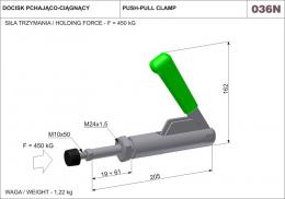 Siła trzymania 450 KG. Długość całkowita 176 mm. Wysokość 159 mm. Skok tłoka dociskowego 67 mm. Docisk szybkomocujący pchająco-ciągnący. Ocynkowane i pasywowane. Nity ze stali nierdzewnej. Ergonomiczna rękojęść z zielonego tworzywa sztucznego olejoodpornego. Docisk występuje bez podstawy, proponujemy zastosować naszą podstawę nr 136N. Sprzedawane w komplecie z ocynkowaną śrubą dociskową M10x50, zakończoną stopką gumową.