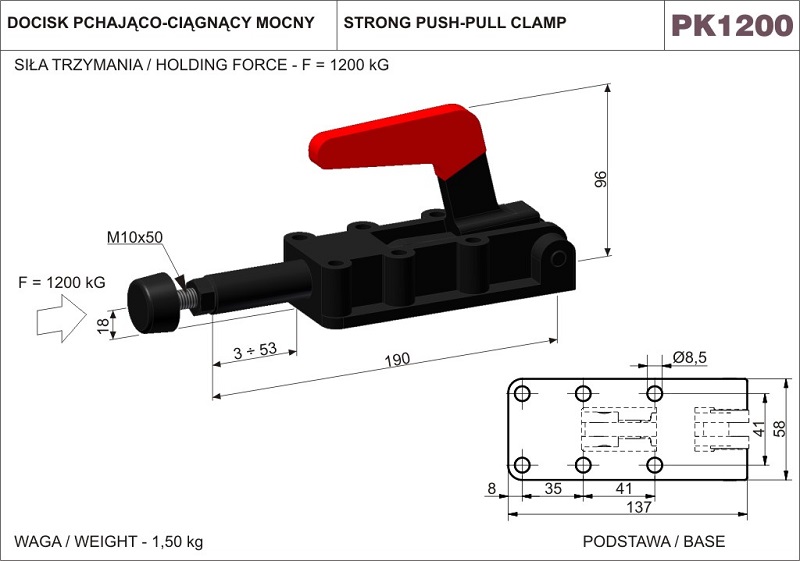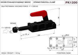 Siła trzymania 1200 KG. Długość całkowita 190 mm. Wysokość 96 mm. Skok tłoka dociskowego 50 mm. Docisk szybkomocujący pchająco-ciągnący mocny. Korpus wykonany z żeliwa ciągliwego, oksydowany. Hartowane sworznie. Elementy dźwigni i łącznika wykonane ze stali ulepszanej, również oksydowane. Rękojeść z czerwonego tworzywa sztucznego, olejoodpornego. Sprzedawane w komplecie z ocynkowaną śrubą dociskową M10x50, zakończoną stopką gumową.