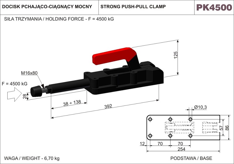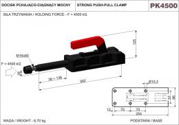 Siła trzymania 4500 KG. Długość całkowita 392 mm. Wysokość 125 mm. Skok tłoka dociskowego 100 mm. Docisk szybkomocujący pchająco-ciągnący mocny. Korpus wykonany z żeliwa ciągliwego, oksydowany. Hartowane sworznie. Elementy dźwigni i łącznika wykonane ze stali ulepszanej, również oksydowane. Rękojeść z czerwonego tworzywa sztucznego, olejoodpornego. Sprzedawane w komplecie z ocynkowaną śrubą dociskową M16x80, zakończoną stopką gumową.