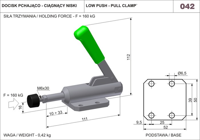Siła trzymania 160 KG. Długość całkowita 111 mm. Wysokość 112 mm. Skok tłoka dociskowego 23 mm. Docisk szybkomocujący pchająco-ciągnący niski.