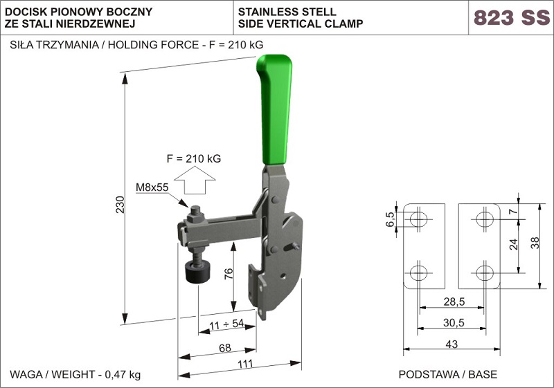 Siła trzymania 210 KG. Długość całkowita 111 mm. Wysokość 230 mm. Docisk szybkomocujący pionowy boczny ze stali nierdzewnej z otwartym naciskaczem. Wszystkie detale docisku zostały wykonane se stali nierdzewnej. Ergonomiczna rękojeść z zielonego tworzywa sztucznego olejoodpornego. Sprzedawane w komplecie z nierdzewną śrubą dociskową M8x55, zakończoną gumową stopką.
