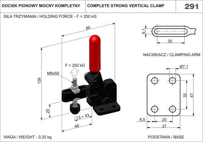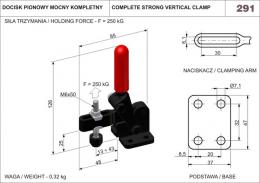 Długość całkowita docisku wynosi 85mm a wysokość 126mm. Docisk z jednolitym naciskaczem i podstawą poziomą. Nawęglane i smarowane tulejki ślizgowe. Sworznie hartowane, szlifowane i smarowane dobrze przyczepnym smarem. Regulacja nakrętką zaciskową w ramieniu dźwigni. Tworzywo: stal oksydowana. Uchwyt wykonany z czerwonego, olejoodpornego tworzywa sztucznego.