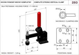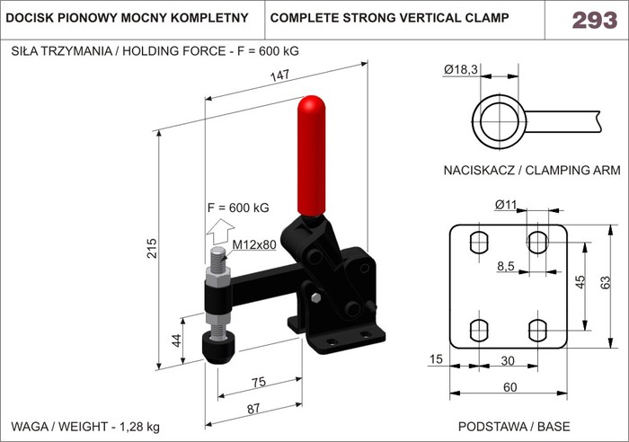 Długość całkowita docisku wynosi 147 mm a wysokość 215 mm. Docisk z jednolitym naciskaczem i podstawą poziomą. Nawęglane i smarowane tulejki ślizgowe. Sworznie hartowane, szlifowane i smarowane dobrze przyczepnym smarem. Regulacja nakrętką zaciskową w ramieniu dźwigni. Tworzywo: stal oksydowana. Uchwyt wykonany z czerwonego, olejoodpornego tworzywa sztucznego.