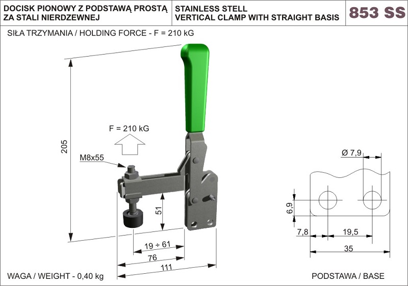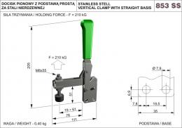 Siła trzymania 210 KG. Długość całkowita 111 mm. Wysokość 205 mm. Docisk szybkomocujący pionowy ze stali nierdzewnej z otwartym naciskaczem z pionową podstawą. Wszystkie detale docisku zostały wykonane se stali nierdzewnej. Ergonomiczna rękojeść z zielonego tworzywa sztucznego olejoodpornego. Sprzedawane w komplecie, z nierdzewną śrubą dociskową M86x55, zakończoną gumową stopką.