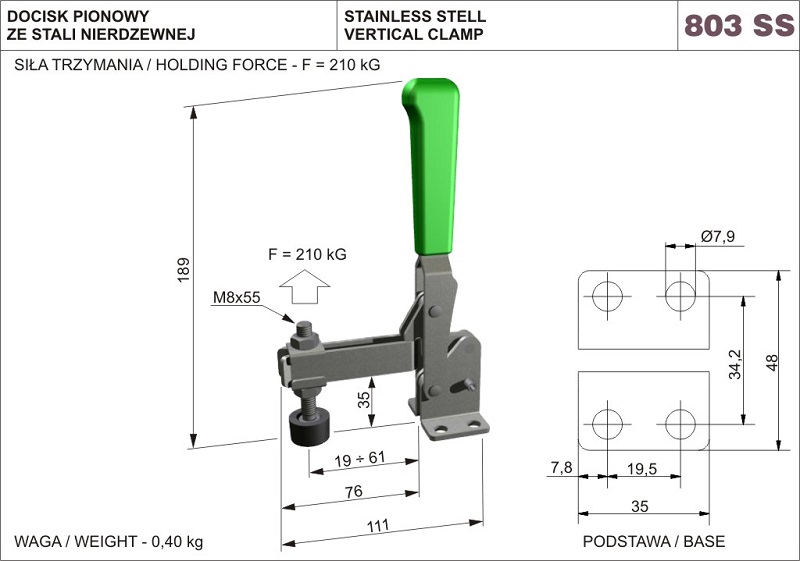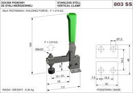 Siła trzymania 210 KG. Długość całkowita 111 mm. Wysokość 189 mm.Docisk szybkomocujący pionowy ze stali nierdzewnej z otwartym naciskaczem z poziomą podstawą. Wszystkie detale docisku zostały wykonane se stali nierdzewnej. Ergonomiczna rękojeść z zielonego tworzywa sztucznego olejoodpornego. Sprzedawane w komplecie z nierdzewną śrubą dociskową M8x55, zakończona stopką gumową.