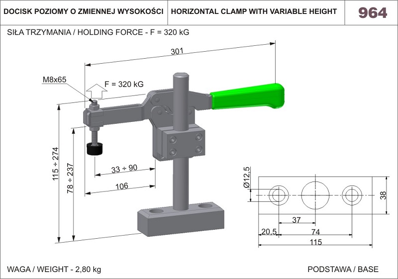 Siła trzymania ok. 320kg. Długość całkowita 301mm. Wysokość docisku 99mm, wysokość słupa 225mm. Docisk szybkomocujący poziomy z otwartym naciskaczem i z pionową, prostą podstawą osadzony na słupie pozwalającym na zmianę wysokości docisku w przedziale od 115mm do 274mm. Ocynkowany i pasywowany. Nity ze stali nierdzewnej. Ergonomiczna rękojeść z zielonego tworzywa sztucznego olejoodpornego. Sprzedawane w komplecie, z ocynkowaną śrubą dociskową M8x65, zakończoną stopką gumową.