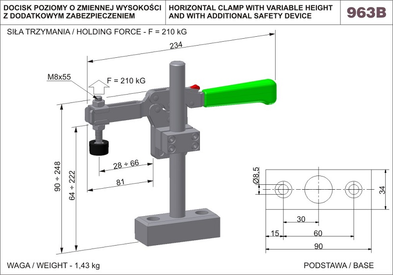 Siła trzymania ok. 210kg. Długość całkowita 234mm. Wysokość docisku 79mm, wysokość słupa 206mm. Docisk szybkomocujący poziomy z otwartym naciskaczem i z pionową, prostą podstawą osadzony na słupie pozwalającym na zmianę wysokości docisku w przedziale od 90mm do 248mm. Wyposażony w dodatkowe zabezpieczenie, uniemożliwiające niekontrolowane otwarcie i zamknięcie docisku podczas pracy. Ocynkowany i pasywowany. Nity ze stali nierdzewnej. Ergonomiczna rękojeść z zielonego tworzywa sztucznego olejoodpornego. Sprzedawane w komplecie, z ocynkowaną śrubą dociskową M8x55, zakończoną stopką gumową.
