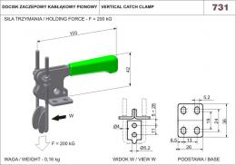 Siła trzymania 200 KG. Długość całkowita 103 mm. Wysokość 51 mm. Skok kabłąka 20 mm. Docisk szybkomocujący zaczepowy kabłąkowy pionowy. Ocynkowane i pasywowane. Nity ze stali nierdzewnej. Hartowane i smarowane tulejki ślizgowe. Kabłąk ulepszany cieplnie. Ergonomiczna rękojęść z zielonego tworzywa sztucznego olejoodpornego.