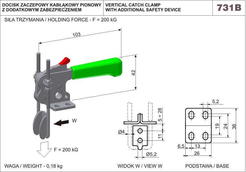 Docisk zaczepowy kabłąkowy pionowy z dodatkowym zabezpieczeniem o sile trzymania 200 KG