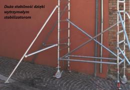 Pojedyncze rusztowanie jezdne o szerokości 75 cm i wysokości 180 cm jest bardzo stabilne dzięki wytrzymałym stabilizatorom.