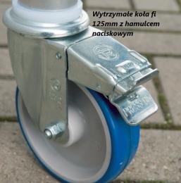 Wytrzymałe koła mają średnicę Φ 125 mm, i są wyposażone w hamulec naciskowy.