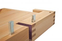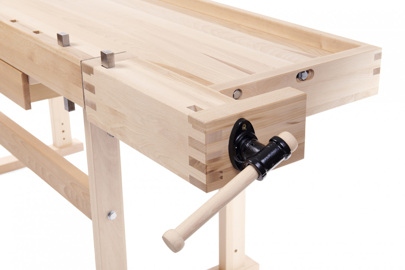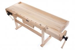 Model PREMIUM wyposażony jest w dwa dociski (niemiecki i francuski) z wysokiej jakości przekładnią śrubową zapewniające skuteczne i mocne ściskanie materiału. W tylnym dociski umieszczono dwa otwory na imaki. Pozostałe 9 otworów rozlokowanych jest na blacie stołu. Wygodna szuflada pozwala na trzymanie najczęściej wykorzystywanych narzędzi zawsze pod ręką. W tylnej części stołu znajduje się strugnica, idelna do przechowywania drobnych narzędzi. Blat stołu wykonany z litego drewna bukowego. Łączenie na wczepy gwarantuje wysoką odporność i żywotność stołu.