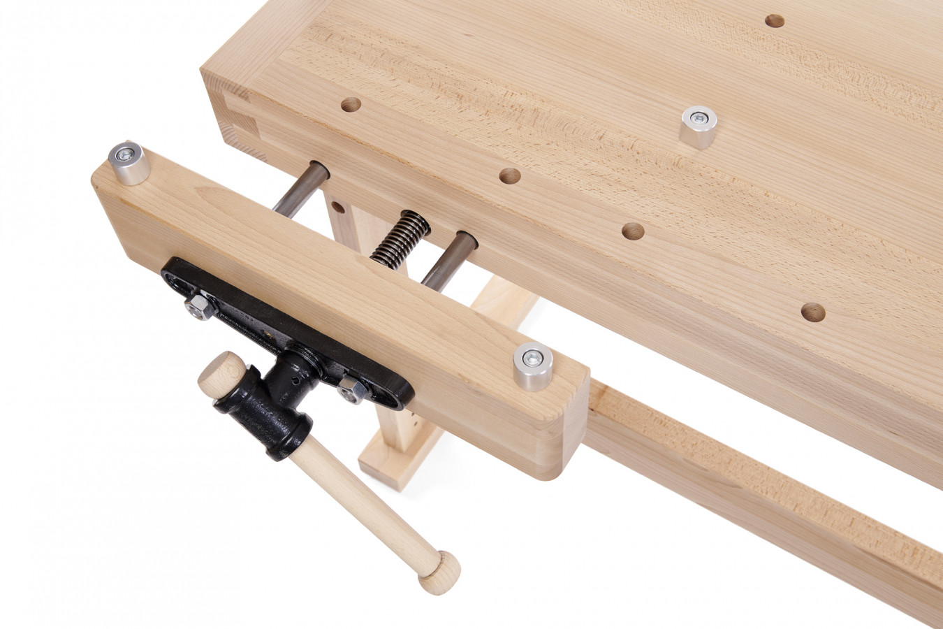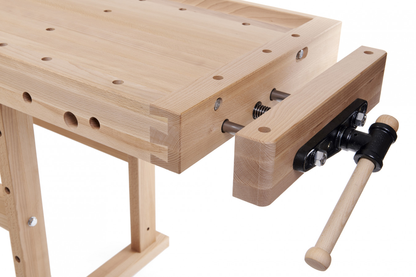 PREMIUM STAR jest stołem przeznaczonym dla większych warsztatów, w których jest dużo miejsca. Stół wyposażony jest w 2 masywne imadła z przodu i z boku. Oba imadła mają długość 480 mm i szerokość 60 mm. Dzięki dwóm rzędom otworów, które można znaleźć na płycie, możesz trzymać materiał w niemal dowolnej szerokości i długości. Na blacie znajduje się 30 otworów. Premium Star jest zaprojektowany do dużych obciążeń. Kolejną zaletą tego modelu jest możliwość przełożenia imadeł do pracy dla leworęcznych i praworęcznych. W stelażu stołu znajdują się 3 otwory, które w połączeniu z przednim imadłem umożliwiają pionowe mocowanie materiału. Wzdłuż całej długości blatu znajduje się strugnica.