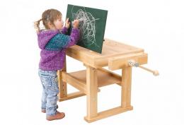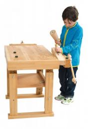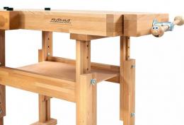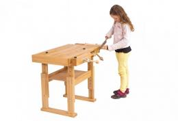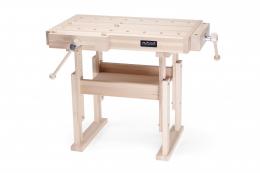 Stół z regulacją wysokości wykonany jest z najwyższej jakości drewna bukowego. Dzięki podstawie o regulowanej wysokości można z łatwością dostosować stół warsztatowy do wieku i wzrostu dziecka. Przewidziany dla dzieci od 3 do 12 roku życia. Najniższa wysokość robocza to 620 mm. Jednak dzięki prostej regulacji wysokości co 50mm można zwiększyć wysokość do 670 mm, 720 mm i 770 mm. Strugnica wyposażona jest w przedni i boczny docisk z metalowym wrzecionem i drewnianymi prętami prowadzącymi. Do łatwego otwierania imadła używa się drewnianego uchwytu dekoracyjnego. Dzięki drewnianemu wykończeniu nie ma ryzyka zranienia dziecka. Na powierzchni roboczej blatu znajduje się 20 otworów roboczych do włożenia klinów (m.in używanych do blokowania obrabianych materiałów). U dołu podstawy znajduje się półka do przechowywania narzędzi lub zabawek.
