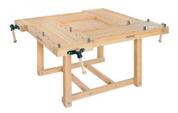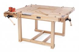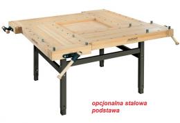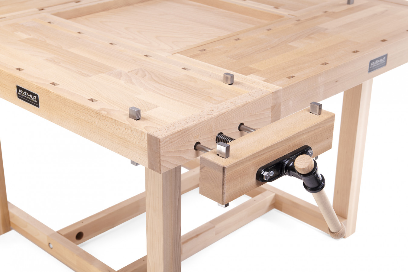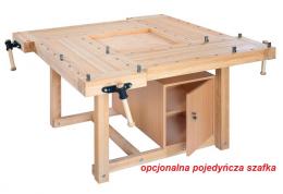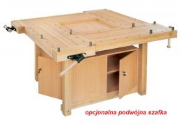 Ten model jest przeznaczony dla większych warsztatów ze względu na swoje gabaryty. Wykonany jest z wysokiej jakości płyty bukowej, co zapewnia wysokie obciążenie, maksymalną trwałość i długą żywotność narzędzia. Strugarka ma cztery wrzeciona z centralną śrubą i dwiema szynami prowadzącymi, aby zapewnić solidne i precyzyjne prowadzenie. Imadła mają szerokość 380 mm i długość 70 mm. Blat stołu składa się z czterech oddzielnych arkuszy z 12 otworami, co daje możliwość mocowania materiału o różnych rozmiarach. Pośrodku strugarki znajduje się kwadrat o wymiarach 600x600 mm, który po obróceniu może służyć jako korytko do odkładania narzędzi lub pozostałości materiału. Jako akcesorium możesz zakupić 1 lub 2 zamykane szafki, które oferują dużo miejsca do trzymania mniej używanych narzędzi.