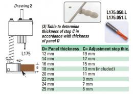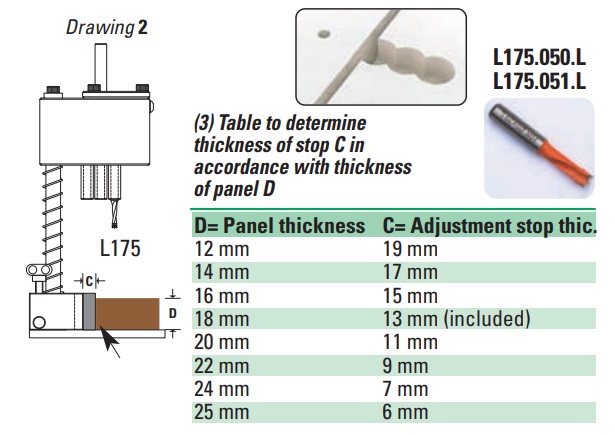 Specjalna podziałka milimetrowa u podstawy trimatic® ułatwia wywiercenie nieprzelotowego otworu fi 5 mm (patrz rysunek poniżej). Należy zamontować wiertło w określonej odległości od krawędzi nawiercanego panelu, stosując dystans "C" (patrz rysunek poniżej), którego rozmiar obliczany jest na podstawie grubości panelu "D" panelu - zgodnie z tabelą (3).