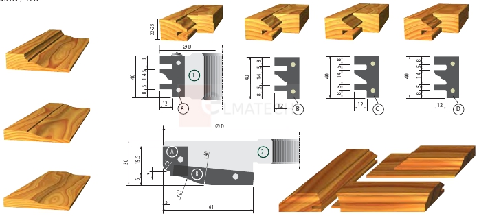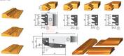 Zestaw dwóch głowic z wymiennymi nożykami (z) z węglika spiekanego HW do produkcji drzwi i frontów o grubości 22-25 mm na zasadzie profil-kontrprofil. Druga głowica do produkcji płycin. Korpusy głowic wykonane ze wysokojakościowego, lekkiego stopu aluminium. W zestawie komplet noży o profilu A. Dodatkowo można zamówić komplety noży o profilu B, C i D. Głowica do produkcji płycin wyposażona w nożyki profilowe które pozwalają na uzyskanie trzech różnych profili w zależności od grubości płyciny i stopnia zagłębienia narzędzia w materiał. Narzędzie z limiterem prędkości posuwu (MAN) ułatwia pracę na obrabiarkach z posuwem ręcznym.